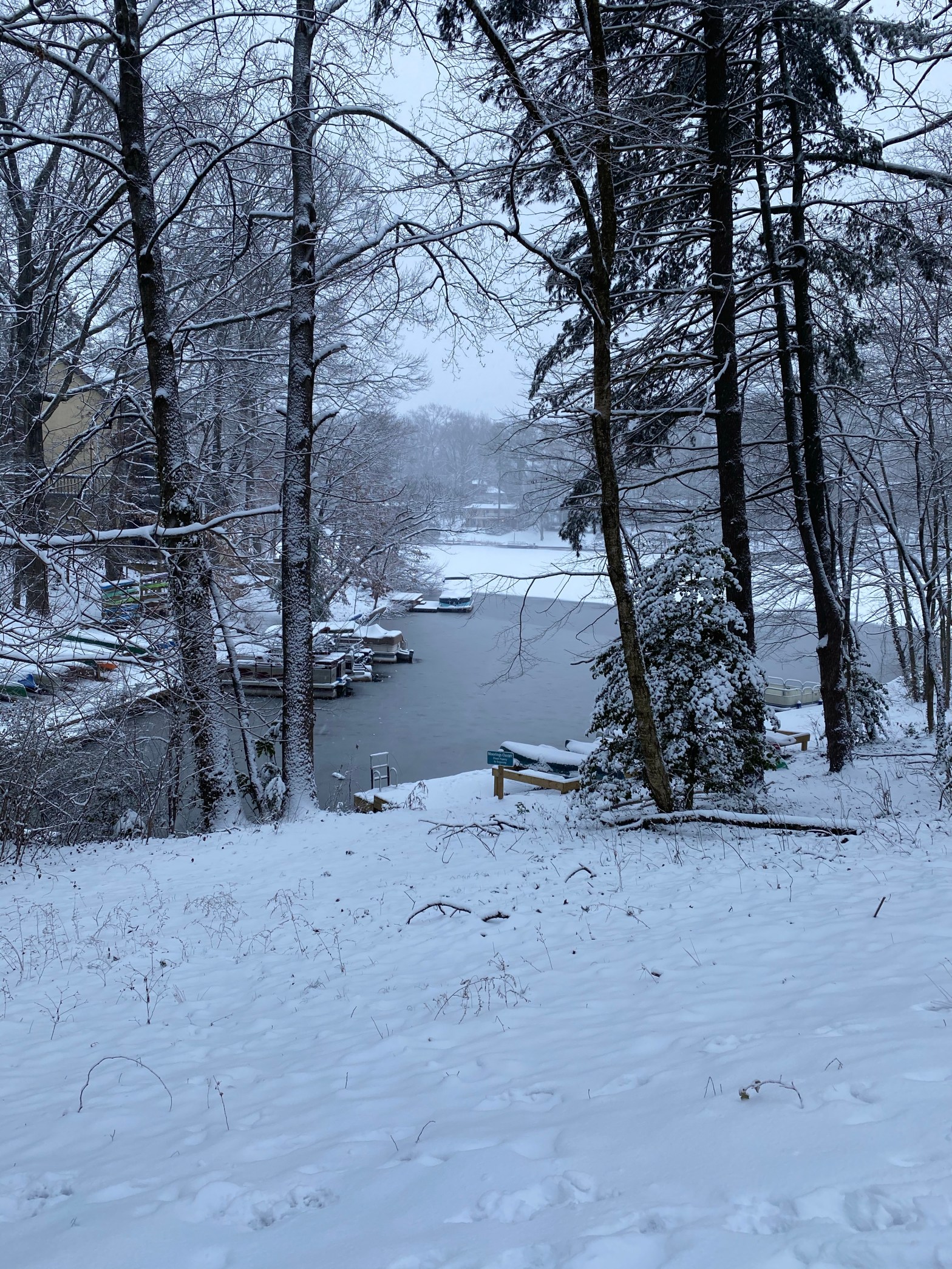 frozen Lake Anne holds snow-covered boats, no skaters. looks like Christmas card