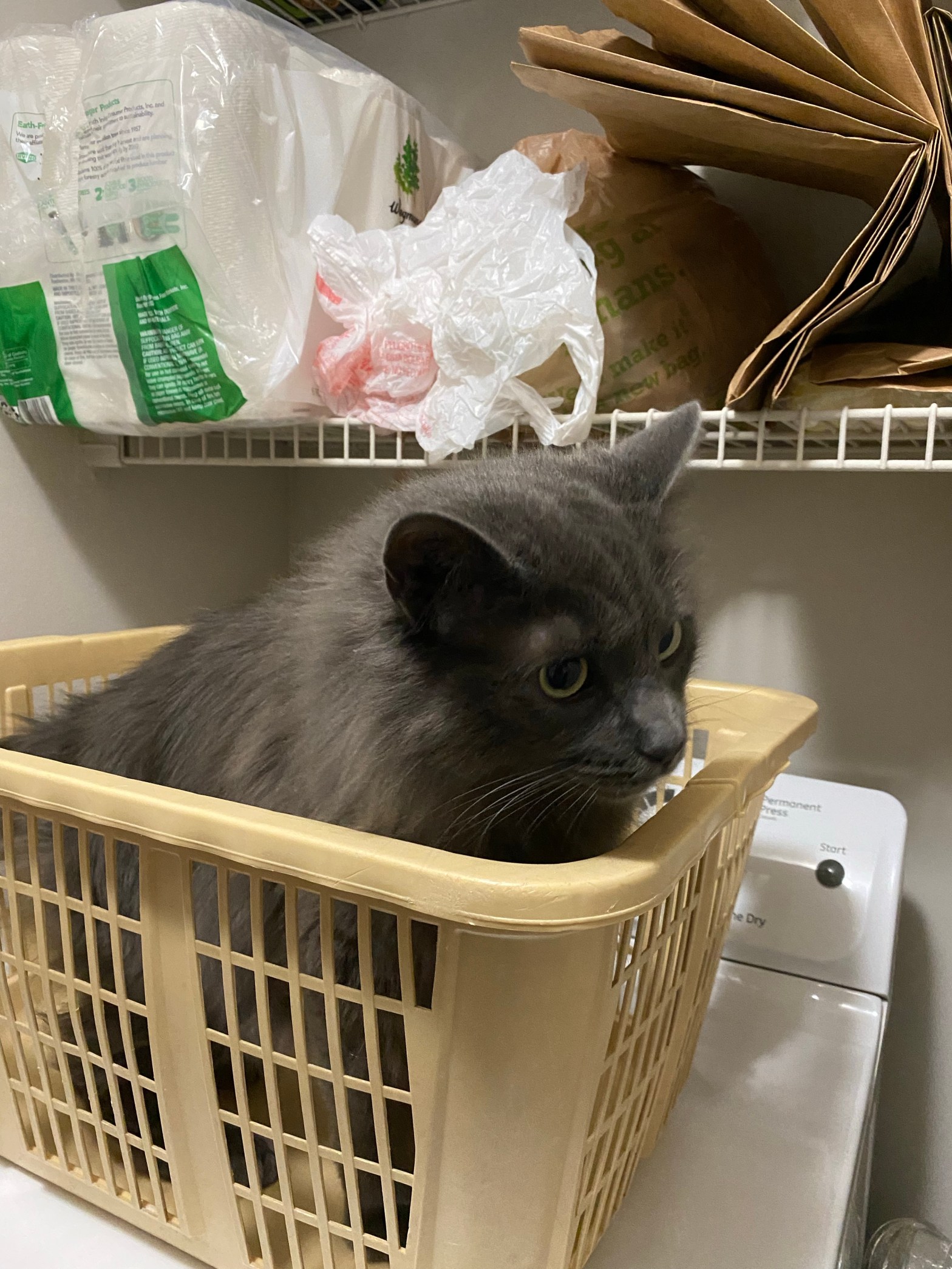 laundry basket holdscat, warm and fluffy withoutgoing in dryer